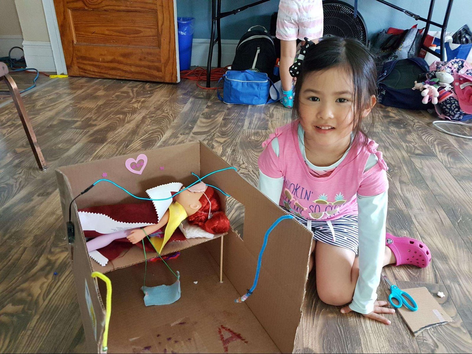 Using cardboard, tubes, craft materials and LED lights, campers design and build towers, castles, houses, skyscrapers and city landmarks.
